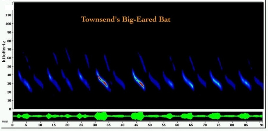 Lucky for bat researchers and wildlife biologists, bats are continuously sending out 5 to 15 of these pulses of sound whenever they are flying. Over the past 20 years, the equipment used to record these ultrasonic bat calls has advanced to the point that we have handheld “bat detectors” and software programs can analyze and identify the species of bat based solely on the echolocation call.